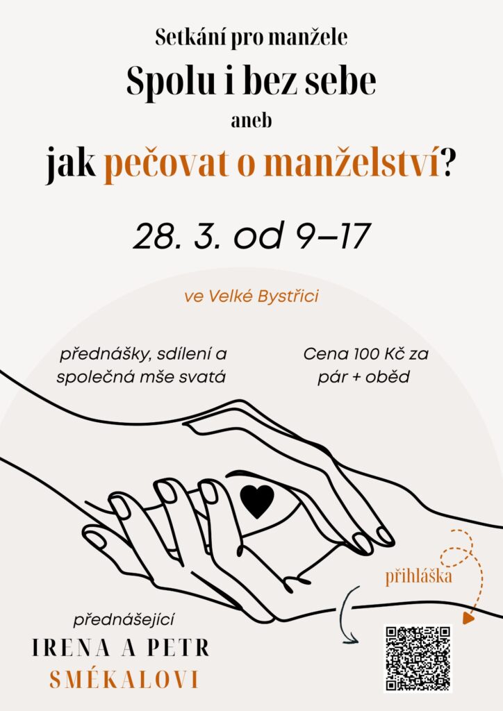Srdečně zveme páry v sobotu 28. března na společné setkání manželů do Velké Bystřice. Na programu budou přednášky, sdílení a mše svatá s obnovu manželských slibů. Přednášet budou manželé Smékalovi, kteří se věnují více jak 15 let manželskému poradenství. Připravili téma Spolu i bez sebe aneb jak pečovat o manželství. Začátek bude v 9:00 a setkání uzavře mše svatá v 16:00. Oběd a občerstvení zajištěno.